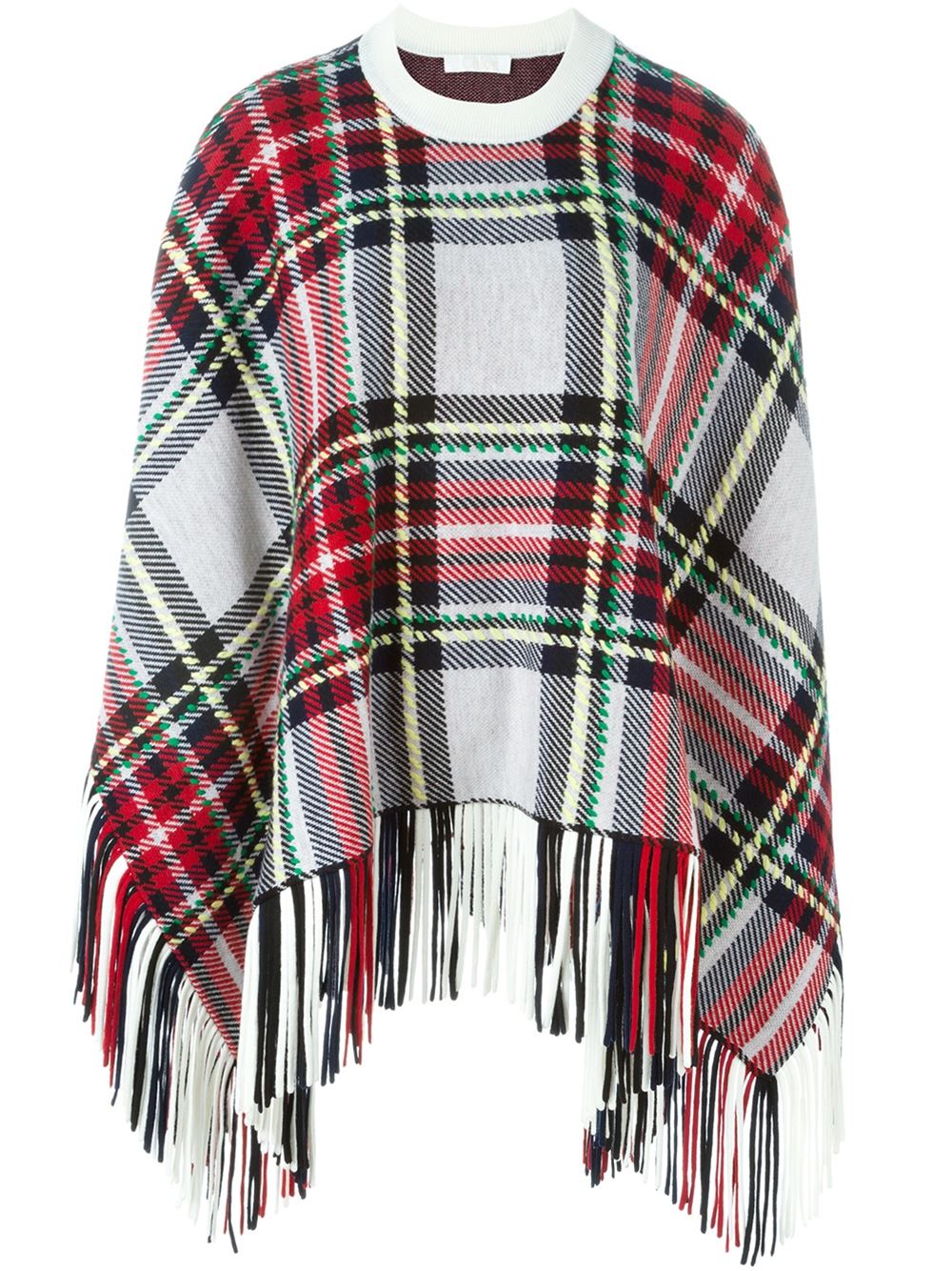 - Chloé 多色 羊毛与羊绒混纺 格纹斗篷。 罗纹针织圆领, 不对称设计, 流苏边。