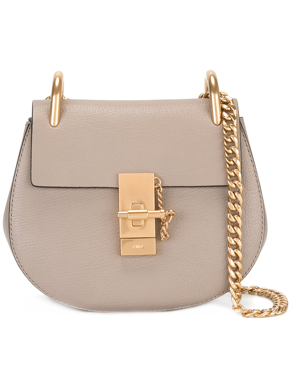 - Chloé (寇依) 灰色 牛皮 Drew单肩包。 搭链肩带, 金色五金配件, 石子质感的皮革表面, 绒面皮衬里, 翻盖饰有旋扣。
