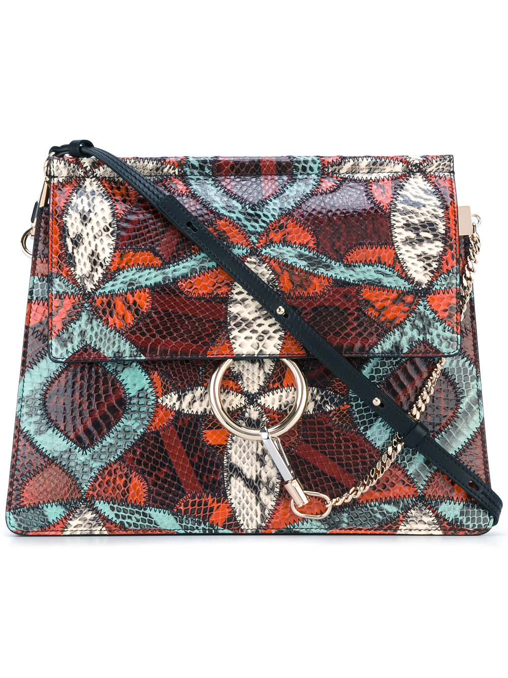 - Plum purple and orange water snake skin Faye shoulder bag from Chloé featuring a foldover top with magnetic closure, snakeskin panels, accordion details at sides, an accordion-style interior, contrasting panels, an internal zipped pocket, a hook and loop strap fastening, an adjustable fastening and patchwork serpent front motif . Please note that this item cannot be shipped outside the E.U.