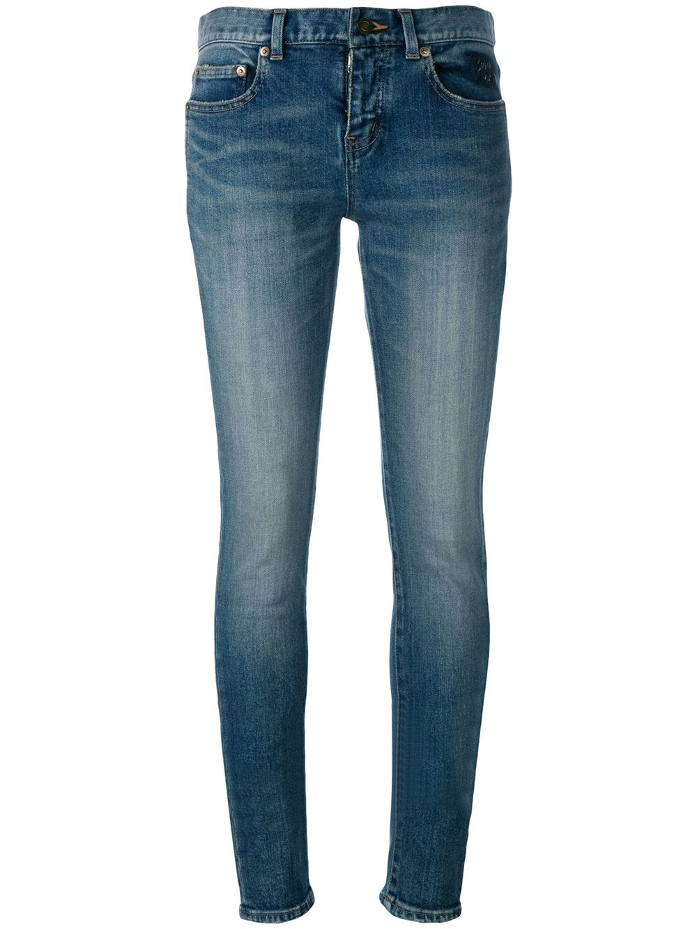 - Dark vintage skinny jeans from Saint Laurent featuring a button and zip fly and side pockets.