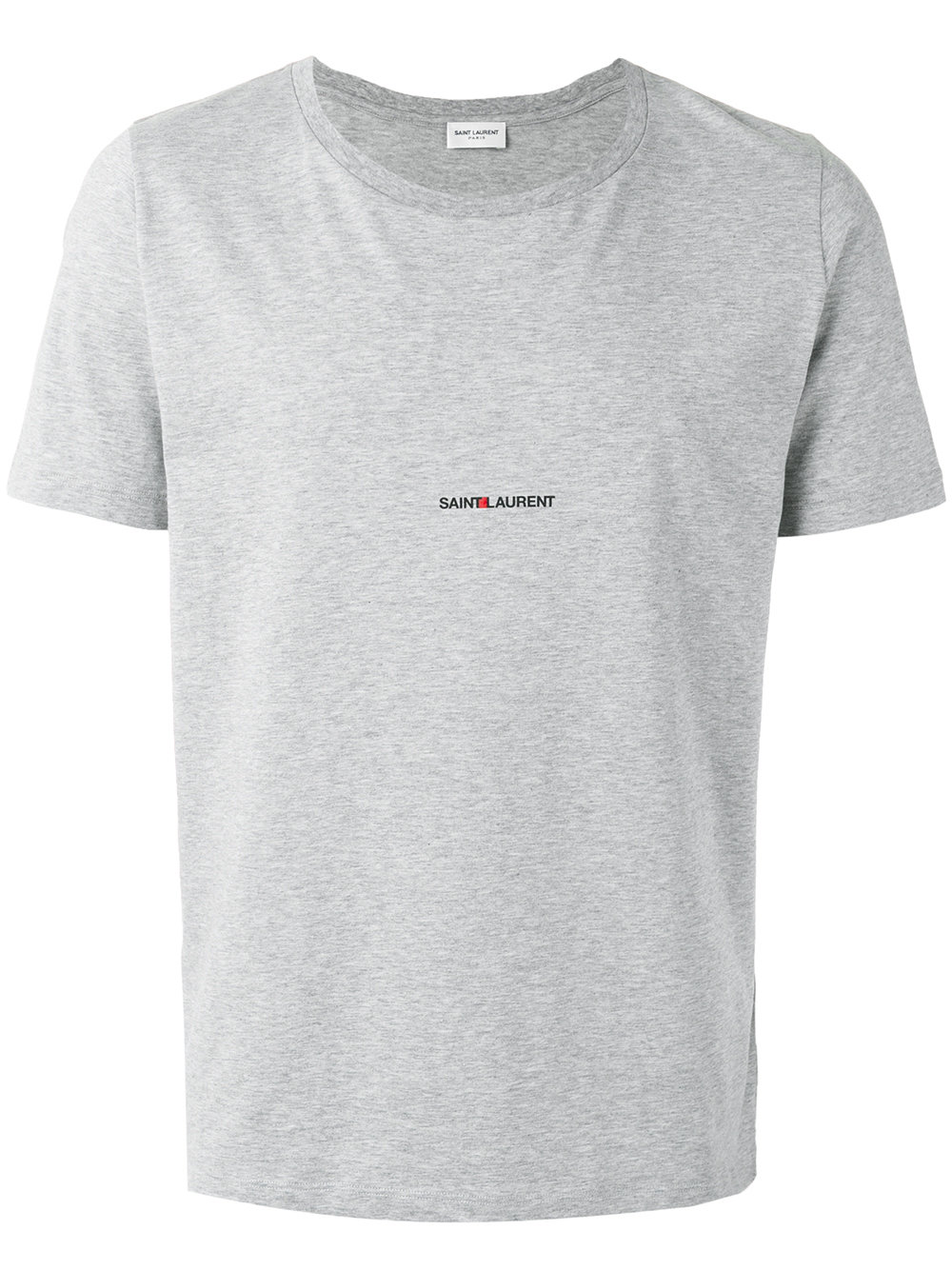 - Grey cotton logo print T-shirt from Saint Laurent featuring a round neck, a printed logo to the front, short sleeves and a straight hem.