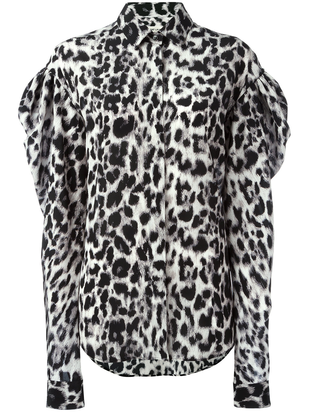 - Saint Laurent (圣罗兰) 黑色与白色 真丝 豹纹印花罩衫。 豹纹, 宽松, 长袖。