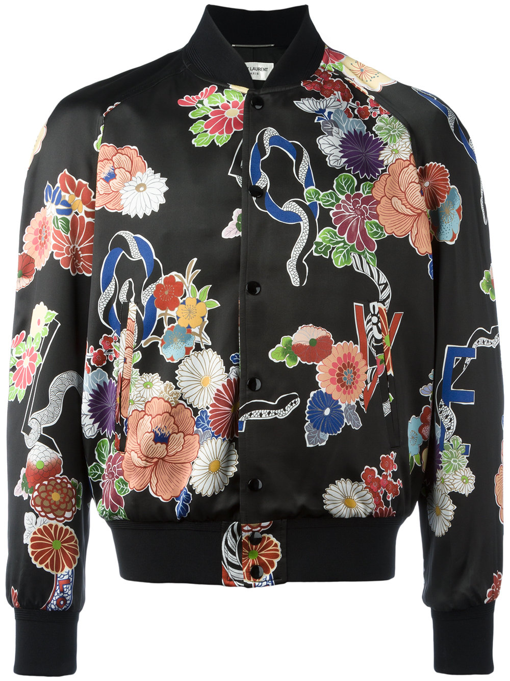 - Multicolour silk-cotton blend lightweight Love teddy jacket from Saint Laurent featuring a ribbed collar, a snap button closure, two front pockets, long length raglan sleeves, a ribbed hem and cuffs, an all-over floral and serpent print and a full lining.