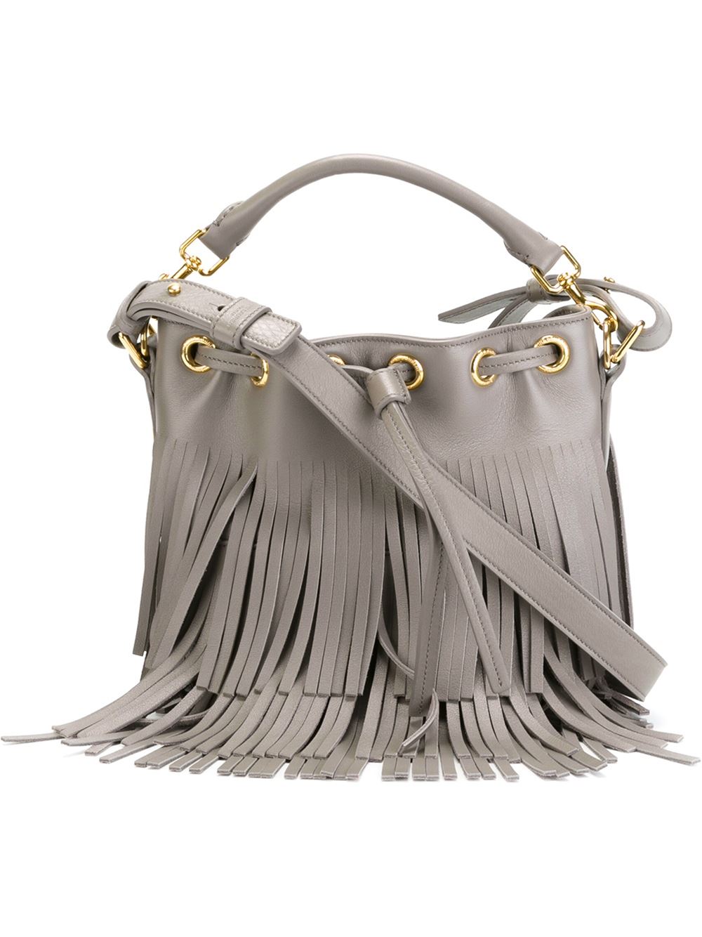- Saint Laurent 灰色 牛皮 'Emmanuelle'小号水桶包。 抽绳, 可拆卸顶部手柄, 可调肩带, 流苏设计, 绒面皮衬里, 内置标贴。