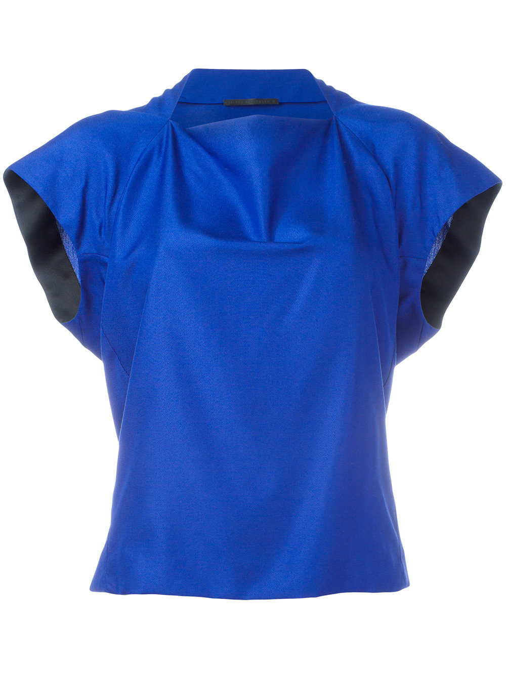 - Royal blue silk-blend slash neck top from Haider Ackermann featuring a slash neck, exaggerated cap sleeves with ruched detail and a fitted waist with a ruched detail at the rear.