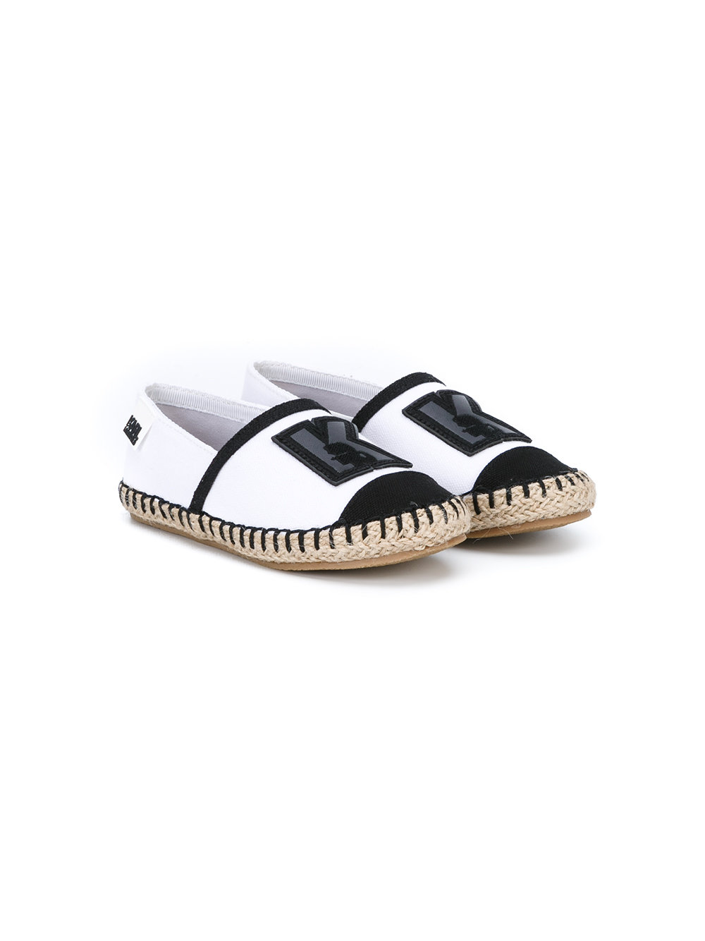 - Black and white canvas slip-on espadrilles from Karl Lagerfeld Kids featuring a branded insole, a slip-on style, a designer logo embroidered detail to the front and a rubber sole.