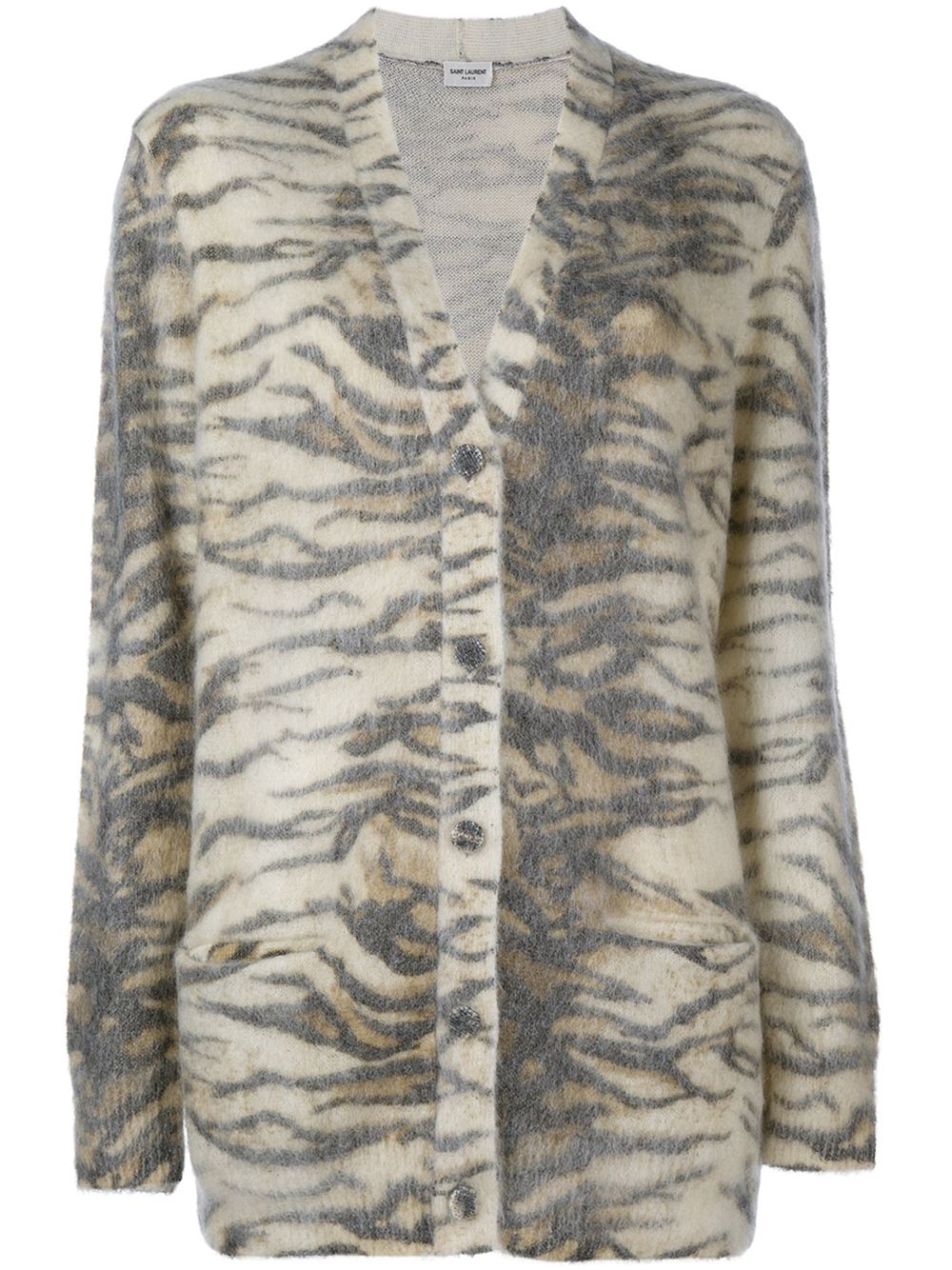 - Saint Laurent 米色与灰色 马海毛混纺 动物纹印花开衫。 正面纽扣, 两个正面口袋。