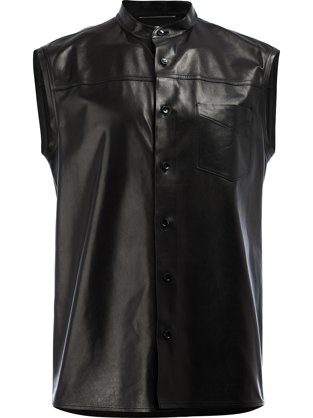 - Saint Laurent (圣罗兰) 黑色 小羊皮 无袖皮革衬衫。 直领, 正面纽扣, 胸袋, 无袖设计, 曲线形底边。