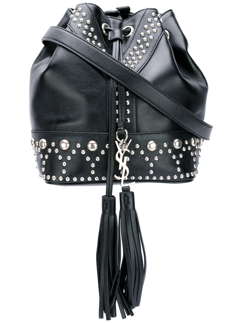 - Saint Laurent (圣罗兰) 黑色 羚羊皮 铆钉流苏背包。 水桶式, 银色铆钉, 抽绳系带, 可调肩带, 内置贴袋。