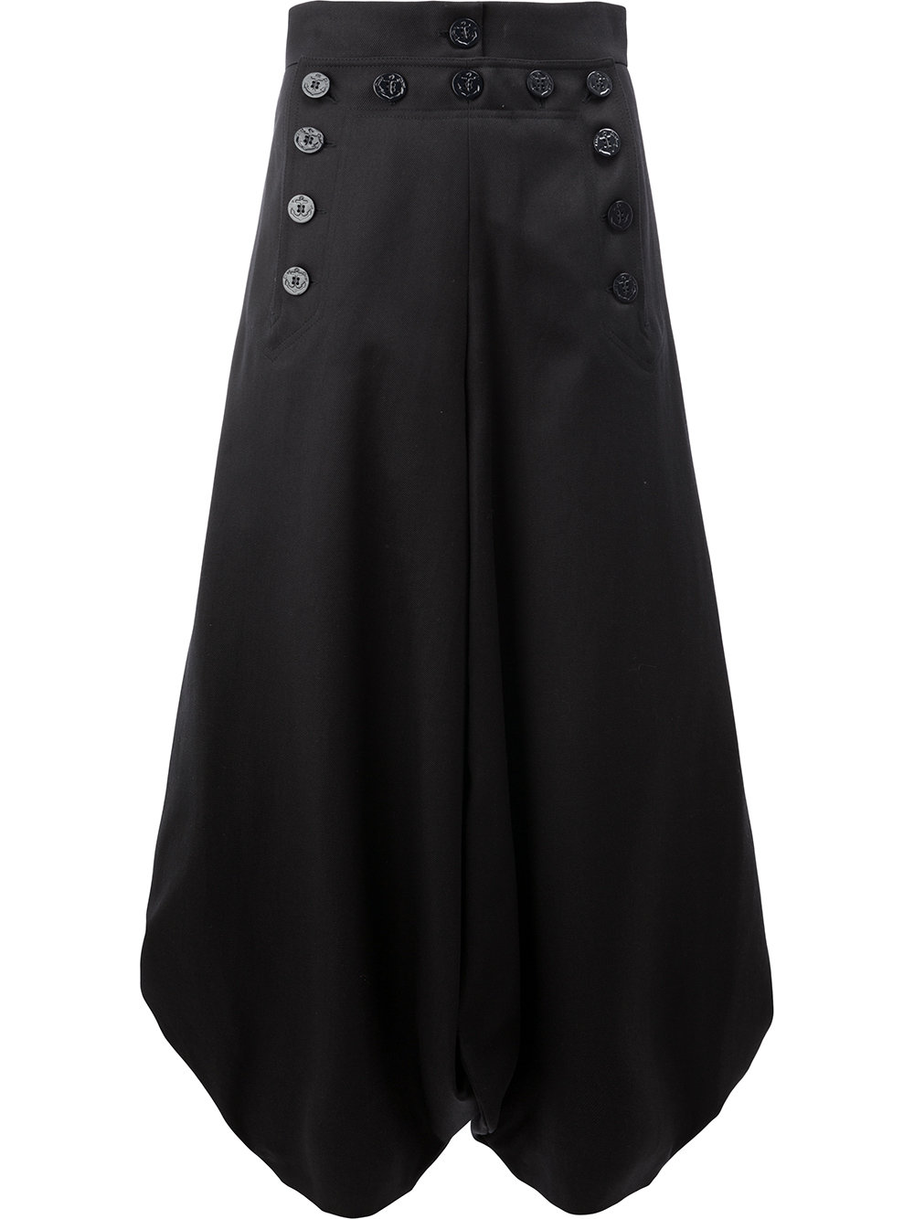 - Chloé (寇依) 深海军蓝色 棉质初剪羊毛 纽扣饰阔腿裤。 高腰, 正面纽扣, 贴身袖口。