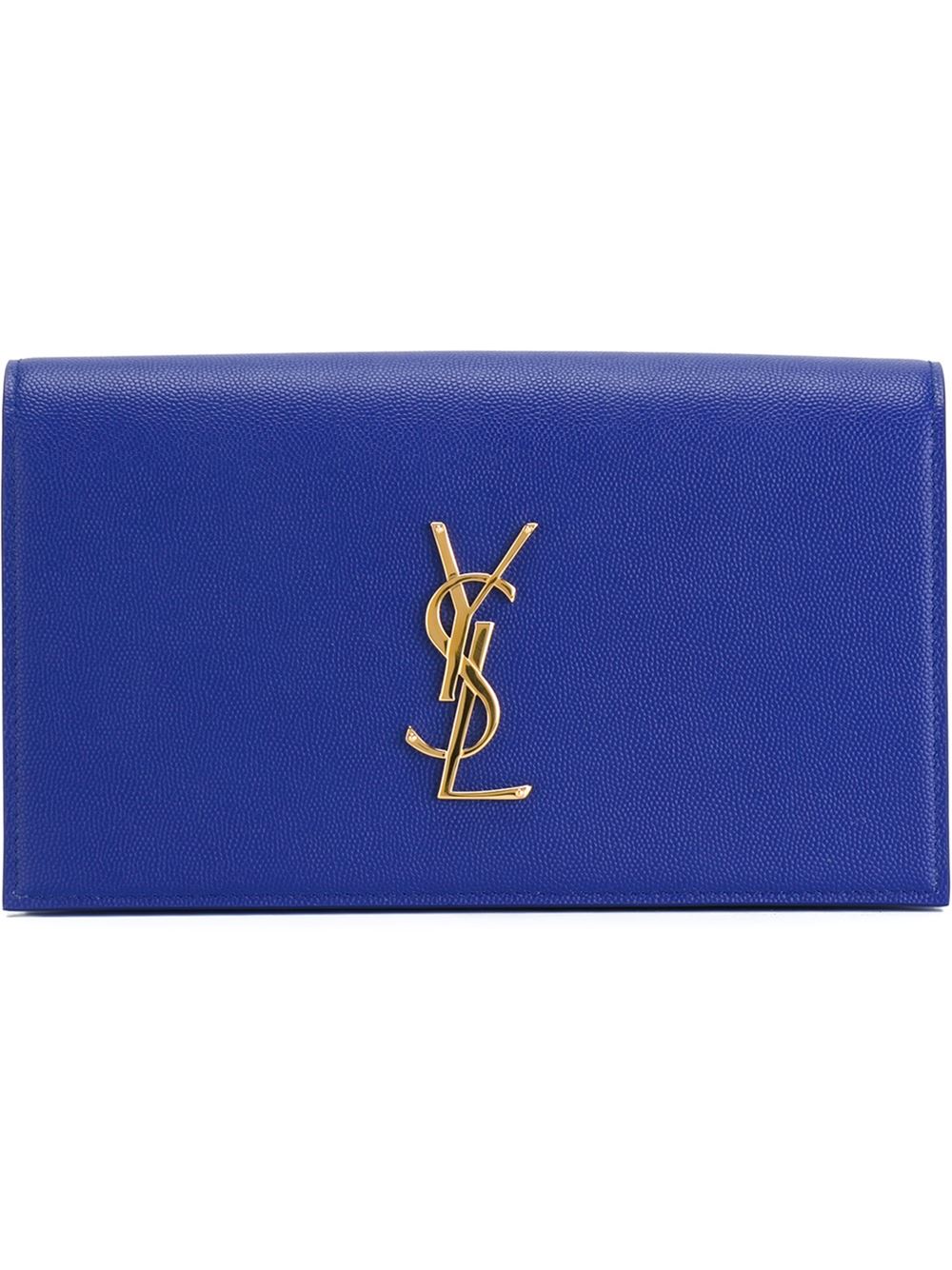 - Saint Laurent 蓝色 小牛皮 'Classic Monogram'手拿包。 长方形, 翻盖饰有插入式的摁扣, 金色标牌, 粗质感皮革, 棉质衬里, 内置贴袋。
