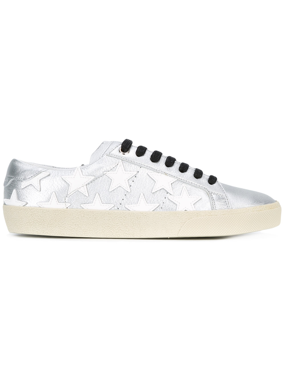 - Silver and white cotton and leather Signature Court Classic SL/06 California sneakers from Saint Laurent featuring a round toe, a lace-up front fastening, a brand embossed tongue, a branded insole, a padded ankle, a back embossed logo stamp, a flat rubber sole and star patch details.