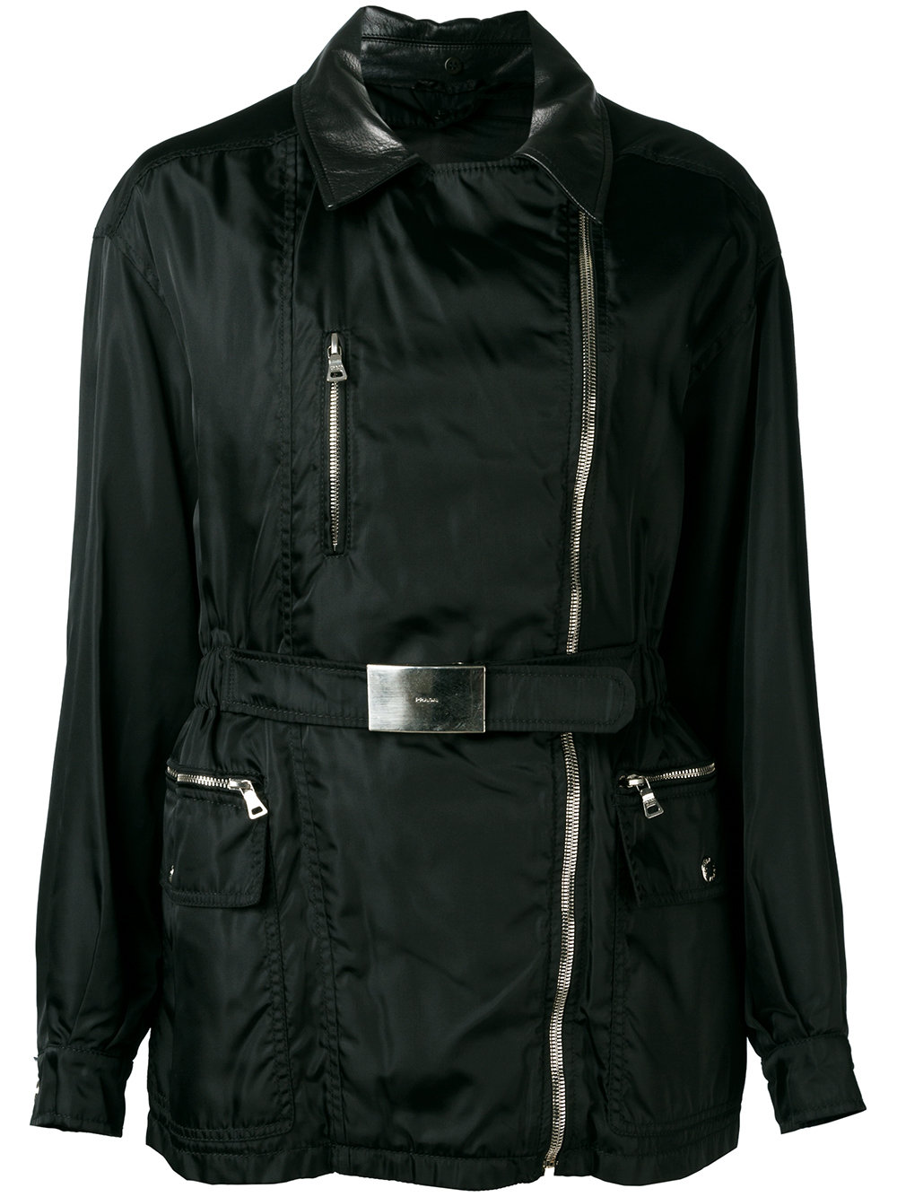 - Black leather collar jacket from Prada Vintage featuring a front zip fastening, side zipped pockets and a belted waist. Circa 1990. Please note that vintage items are not new and therefore might have minor imperfections.