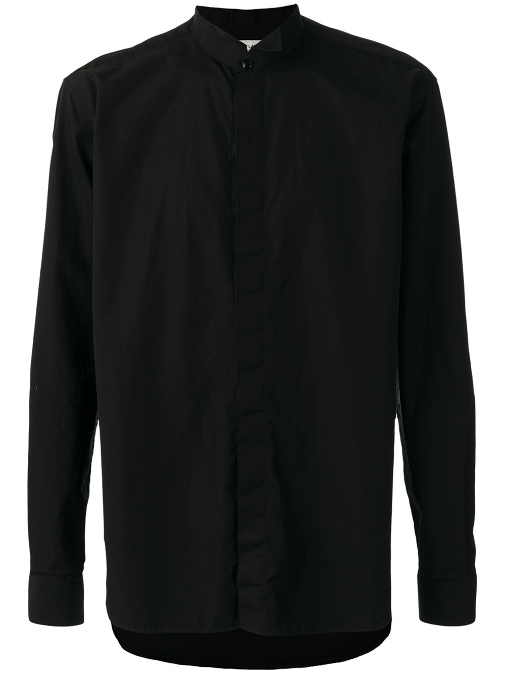 - Black cotton cutaway collar shirt from Saint Laurent featuring a front button fastening, dropped shoulders, long sleeves, button cuffs and a curved hemline.
