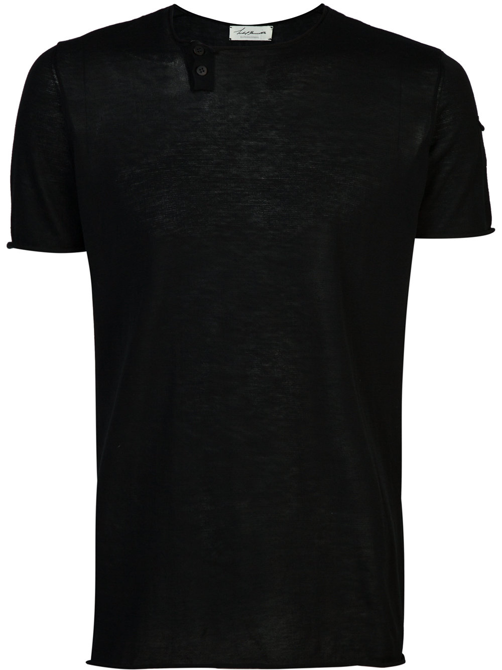 - Set in black with a faded effect, this contemporary T-shirt from Isabel Benenato is a must-have for any modern wardrobe. Featuring a crew neck, short sleeves and asymmetric button detailing to the neck, this contemporary Isabel Benenato design is crafted from pure cotton.