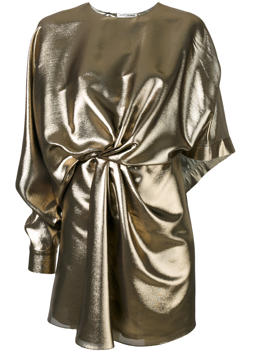 - Stand out from the crowd next time a special occasion calls in this statement Saint Laurent dress. Set in gold and crafted from a silk blend, this stylish Saint Laurent number features an asymmetric style, short length and a metallic sheen.