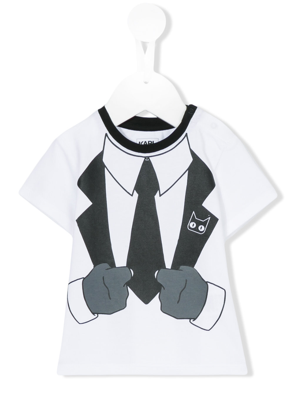 - White stretch cotton tuxedo print T-shirt from Karl Lagerfeld Kids featuring a round neck and short sleeves.