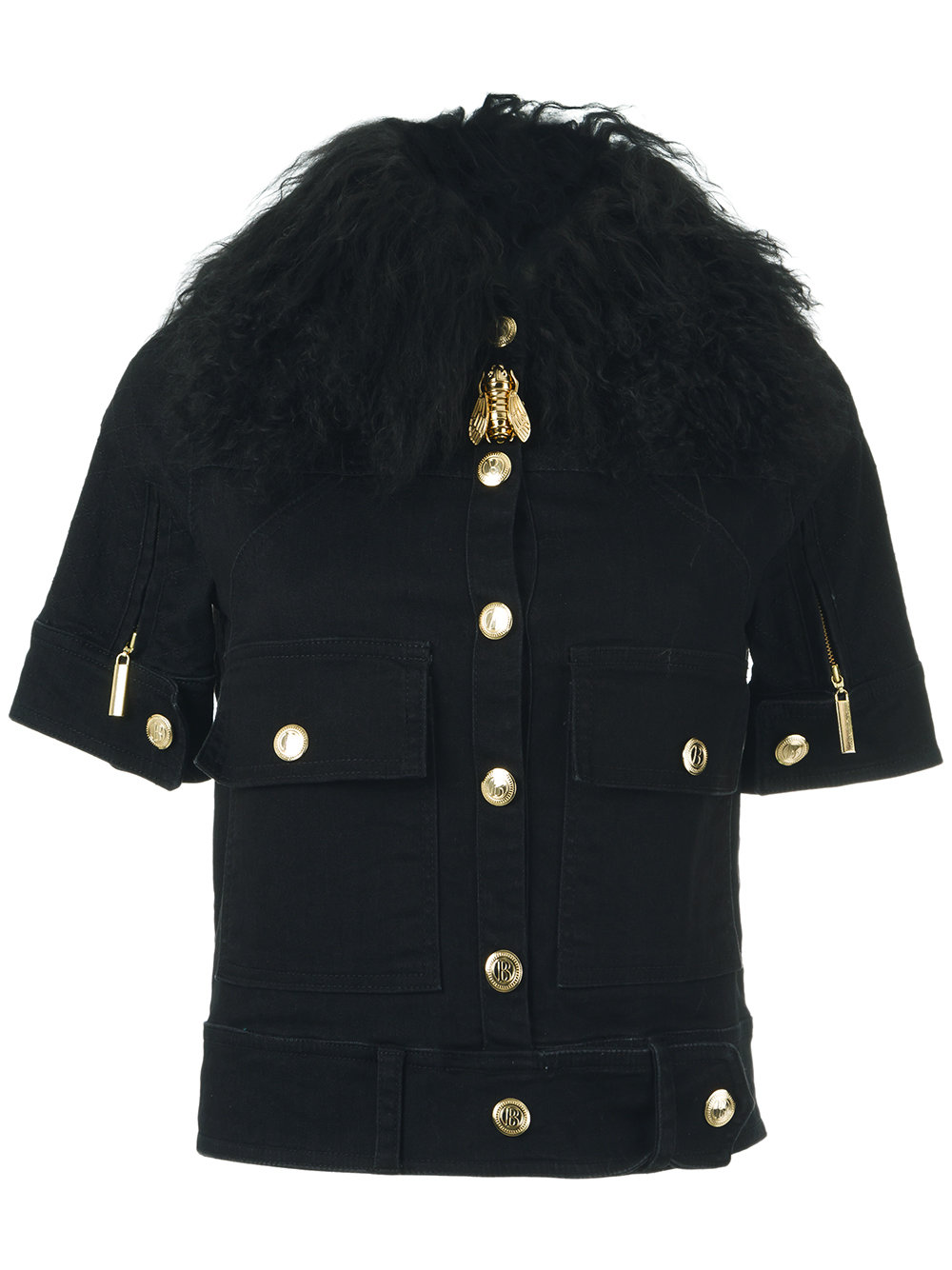 - Black silk jacket from Andrea Bogosian featuring a funnel neck, a front button fastening, short sleeves and pockets.