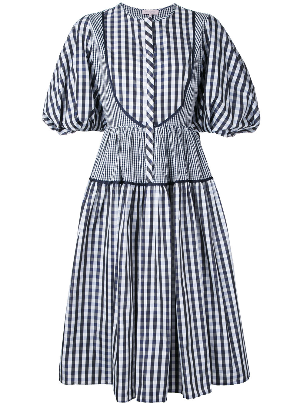 - Dice Kayek 海军蓝色 丝绸混纺 格纹泡泡袖连衣裙。