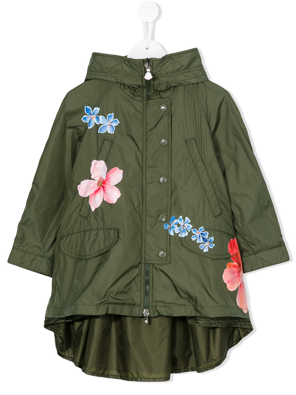 - Green floral print jacket from MONCLER KIDS featuring a hood, a front button fastening, long sleeves, front flap pockets and a curved hem.