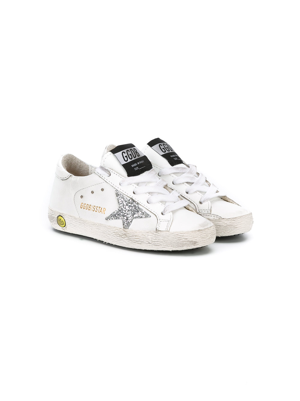 - GOLDEN GOOSE DELUXE BRAND KIDS 白色 小牛皮 Super Star板鞋。 鞋舌部位附有标贴, 仿旧效果, 正面绑带, 圆头, 平底橡胶鞋底。
