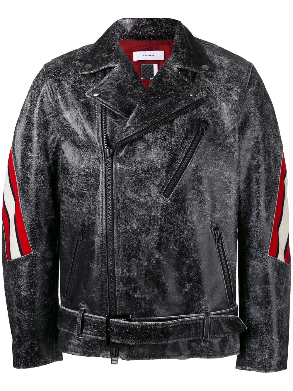 - Facetasm 黑色 小牛皮 条纹拼接机车夹克。