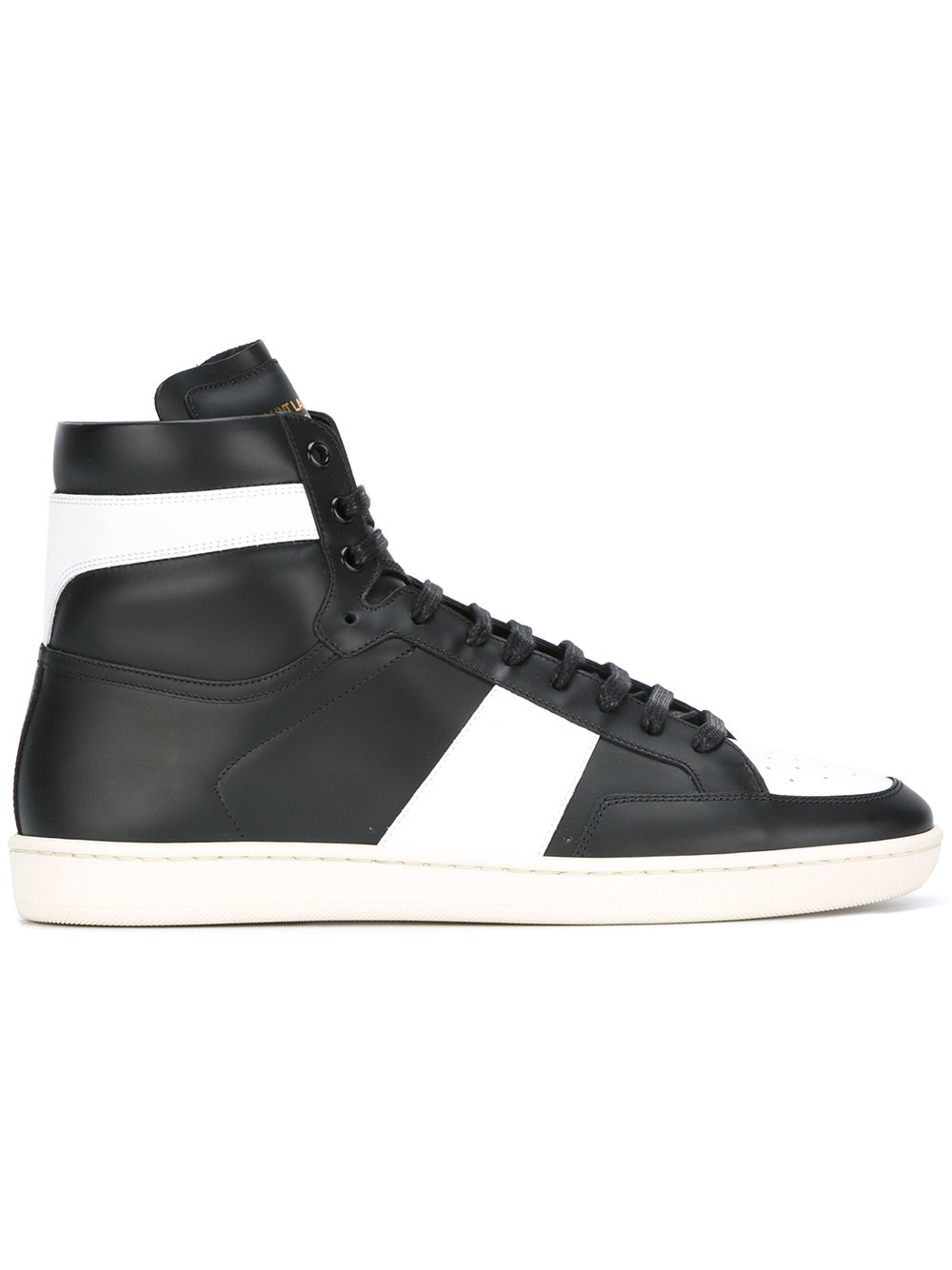 - Saint Laurent (圣罗兰) 黑色与白色 牛皮 Court SL-10高帮板鞋。 系带, 对比拼接设计, 平底。