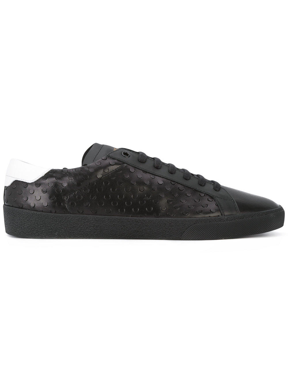 - Saint Laurent (圣罗兰) 黑色 牛皮 雕花设计板鞋。 圆头, 对比色后跟, 系带, 穿孔式细节。