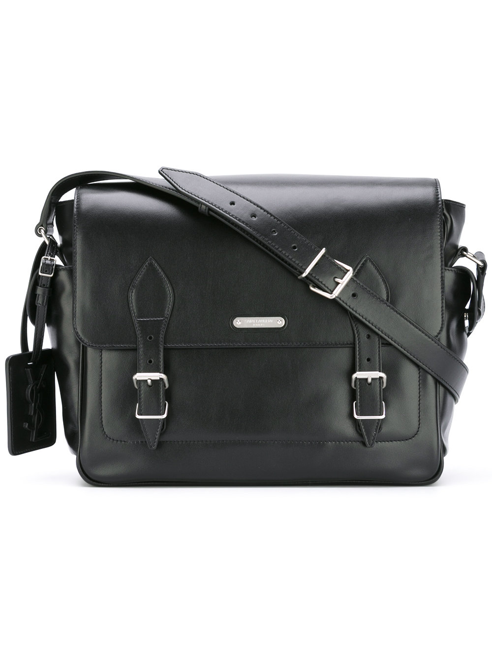 - Saint Laurent (圣罗兰) 黑色 小牛皮 翻盖双扣环斜挎包。 银色五金配件, 环扣开合, 银色标牌, 内置拉链口袋。
