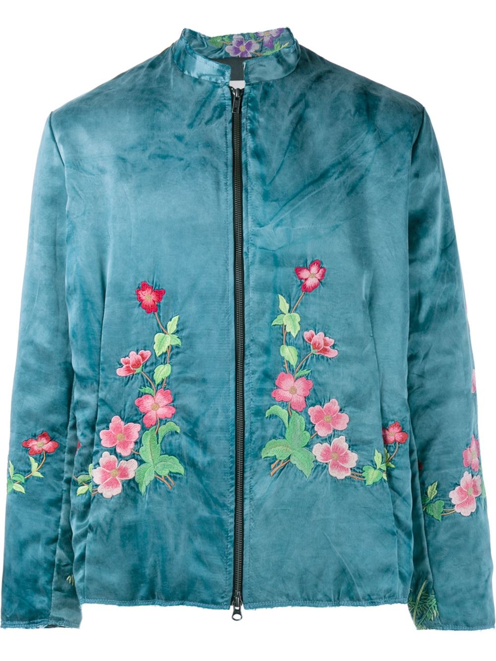 - This blue By Walid embroidered silk jacket is a one-of-a-kind piece from the brand's acclaimed SS '16 ready-to-wear collection. Composed of 19th century antique fabrics, this mesmerising jacket has been cut from lustrous silk and was meticulously composed in England by traditional weaving techniques. Featuring long sleeves and a mandarin collar, this exclusive piece has been finalised with a multi-coloured hand-embroidery across the front and back. Wear this artisan creation over a plain white t-shirt and black jeans for a striking street-ready look.