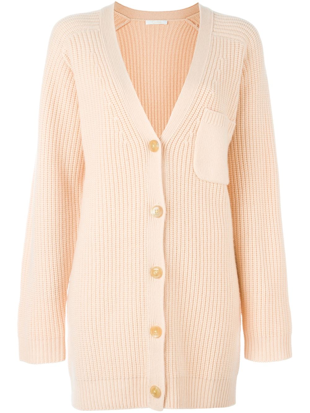 - Chloé 粉色 羊绒 超大款罗纹开衫。 正面纽扣, 长袖, 两个正面口袋, 短款。