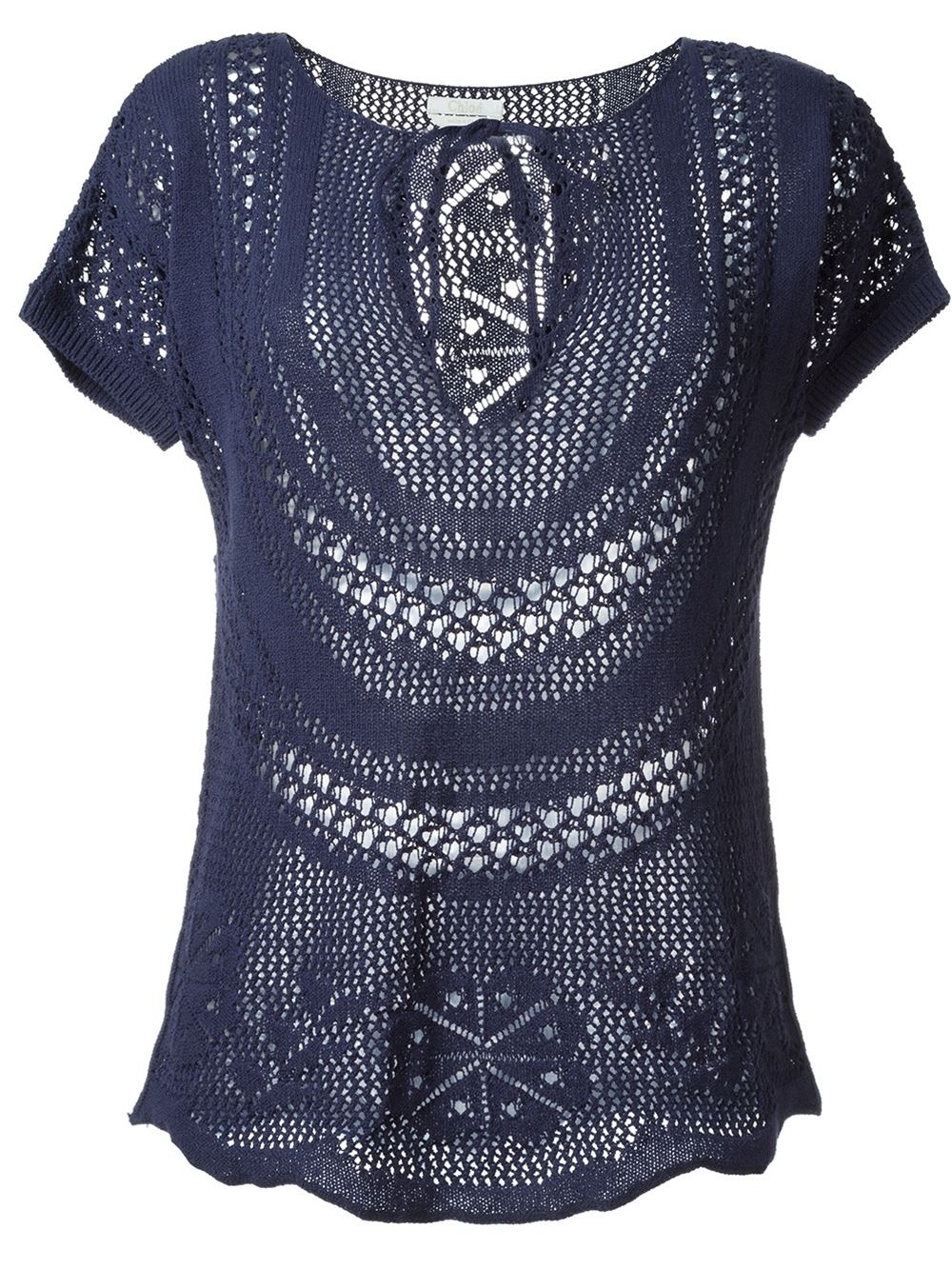 - Chloé 海军蓝色 钩编针织上衣。 钥匙孔式领, 开襟针织, 短袖, 曲线形底边。这件商品尺码适中。