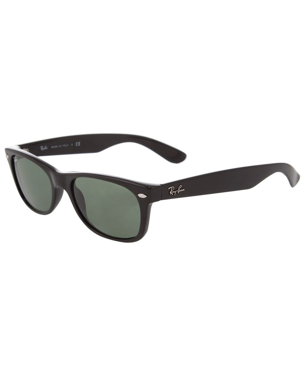 - Black plastic 'New wayfarer' sunglasses from Ray-Ban, featuring grey tinted lenses with full UV protection, metal pin details on the outer upper corners and a small logo on the arm. This item comes with a designer embossed case. Sizes 52 and 54.