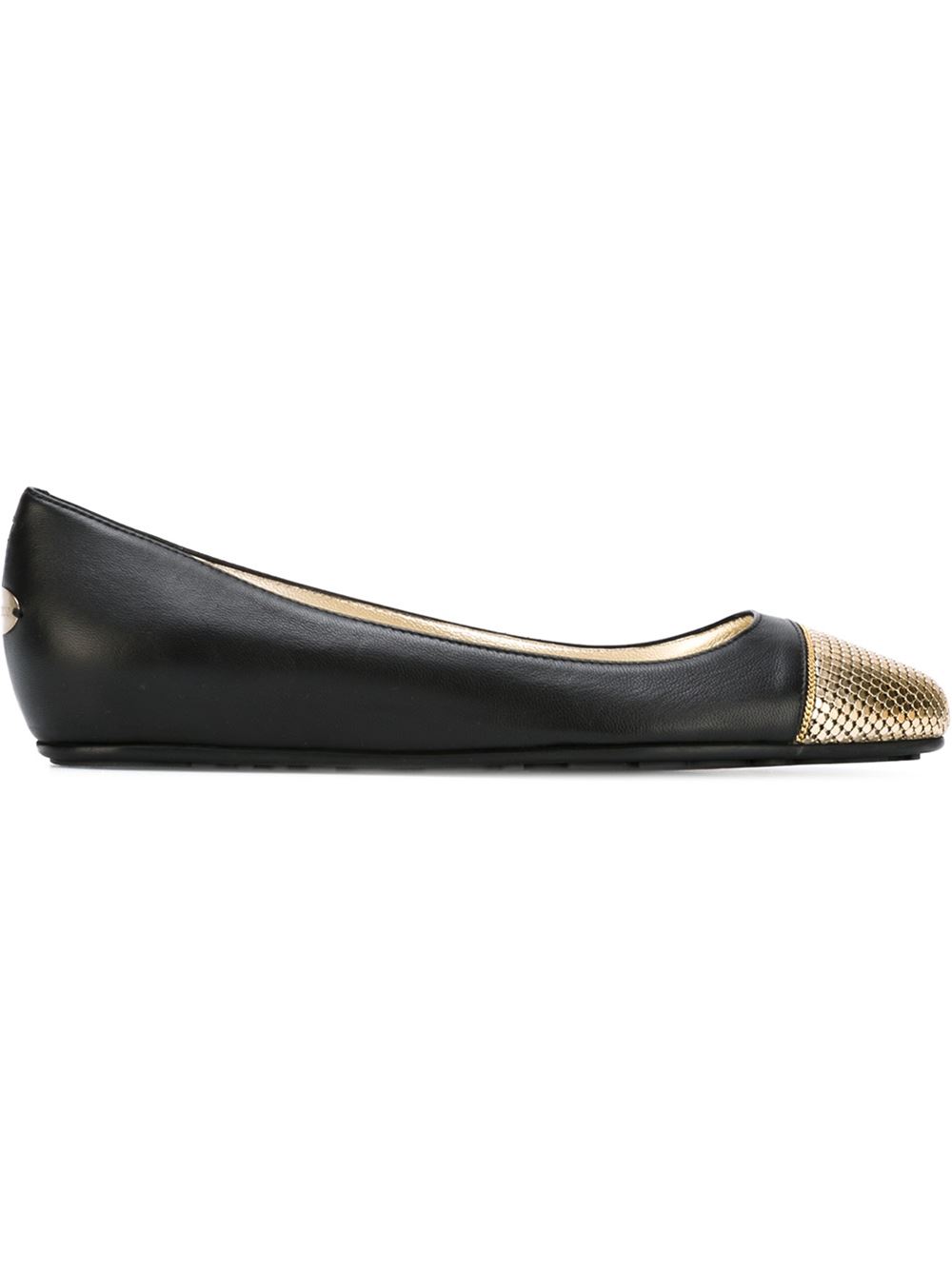 - Jimmy Choo 黑色 真皮 'Waine'芭蕾舞平底鞋。 金色鞋尖, 鞋垫饰有品牌浮雕, 平底。