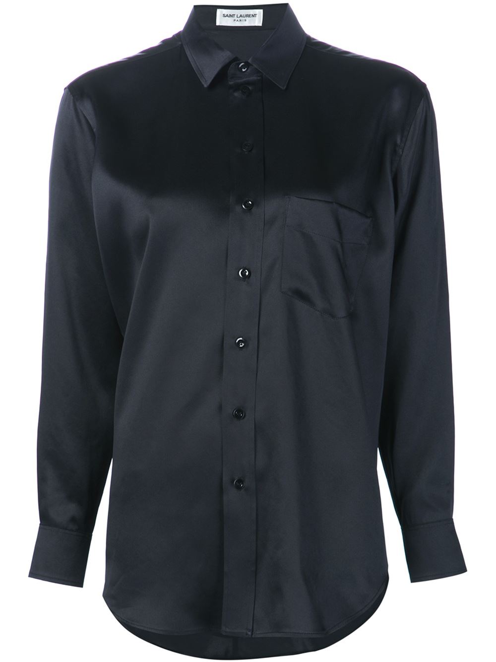 - Saint Laurent 黑色 丝绸 经典衬衫。 经典衣领, 正面纽扣, 长袖, 搭扣袖口, 胸处饰有贴袋, 曲线形底边。