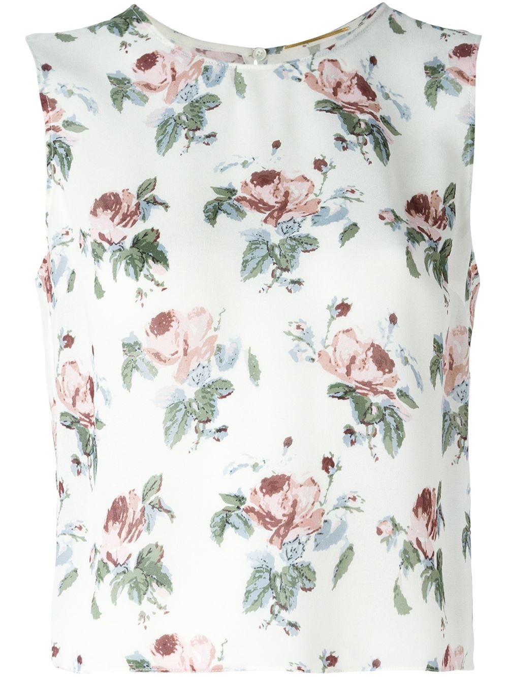 - Saint Laurent 白色 玫瑰印花上衣。 圆领, 无袖设计, 后面有钥匙孔细节, 平直下摆, 短款。这件商品尺码适中。