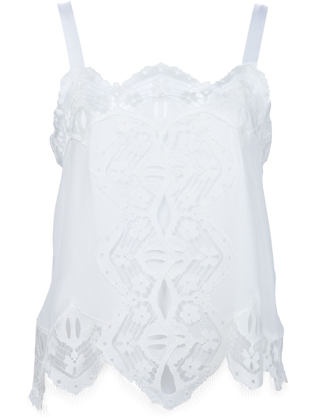 - Chloé 牛奶白色 丝绸 蕾丝嵌花细肩带上衣。 扇贝形领, 刺绣花卉图案设计, 无袖设计, 宽松, 扇贝形下摆。