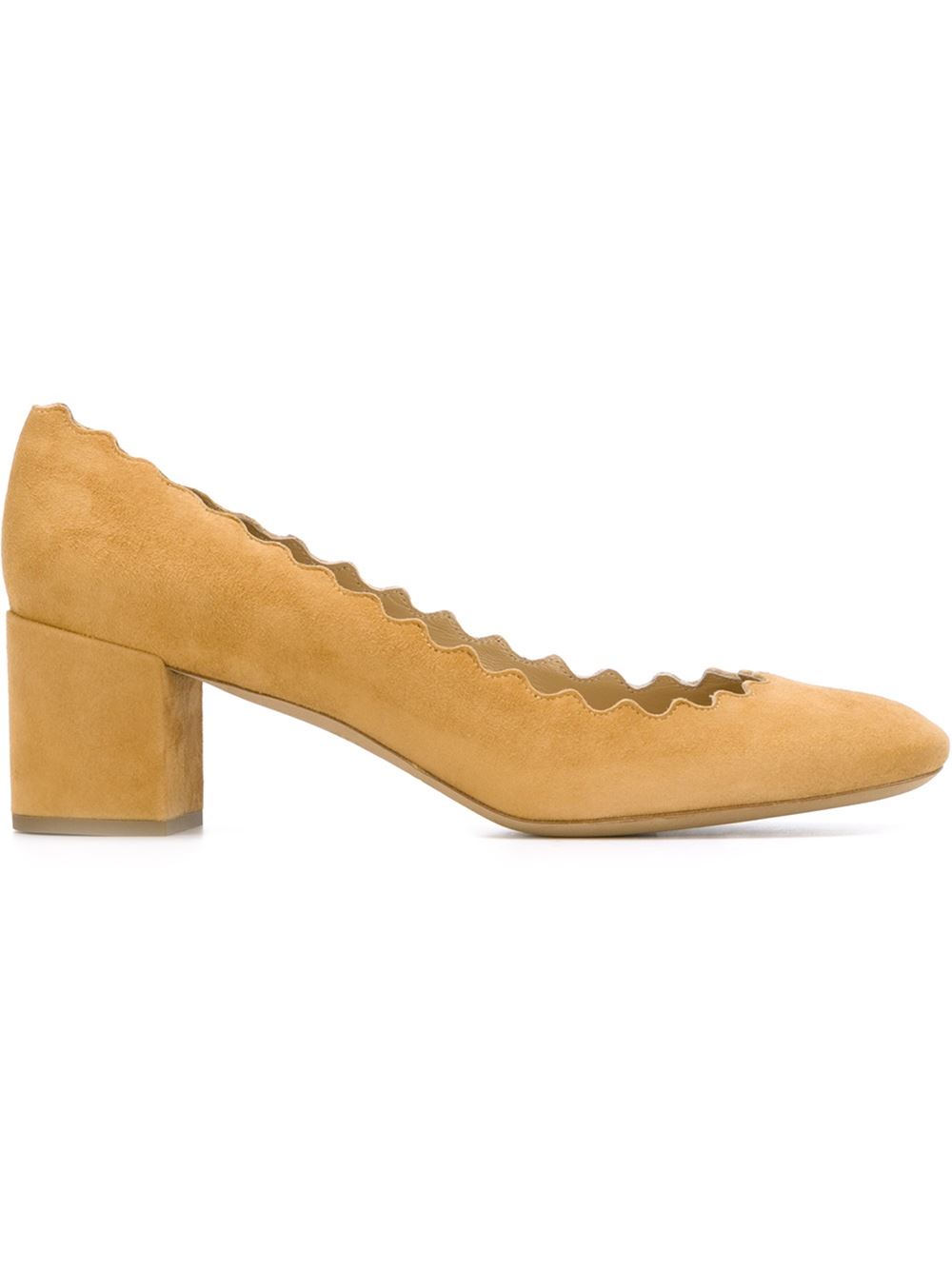 - Chloé 黄色 绒面皮 'Lauren'高跟鞋。 杏仁形鞋尖, 鞋垫饰有品牌浮雕, 中高粗跟, 扇贝形细节。