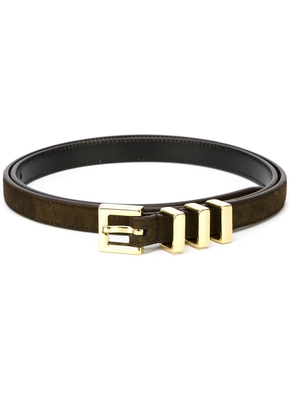 - Saint Laurent 褐色 山羊皮 金环窄版腰带。 正中央有扣子。