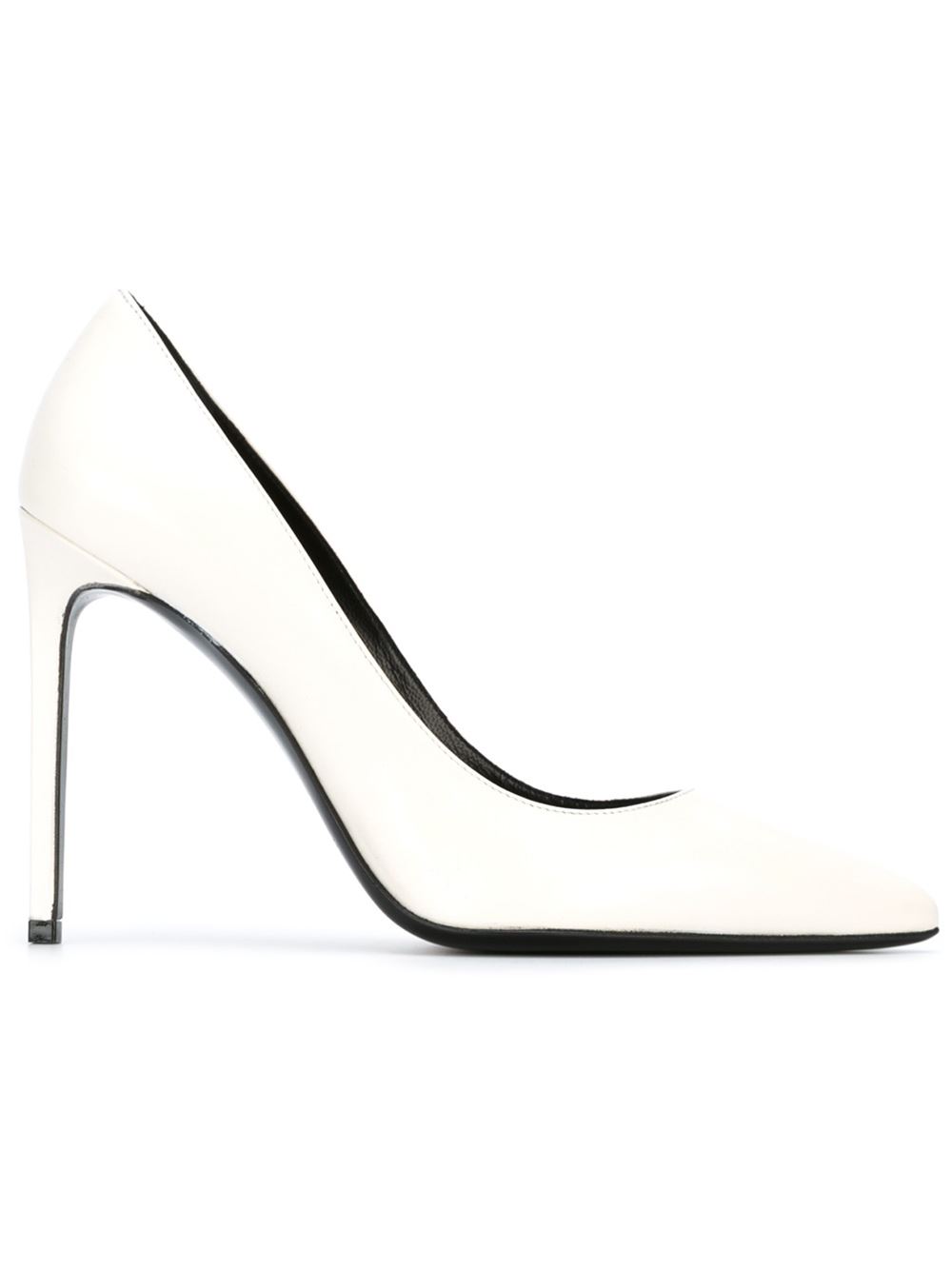 - Saint Laurent 白瓷色 小牛皮 'Paris'高跟鞋。 尖头, 鞋垫饰有品牌浮雕, 细高跟。