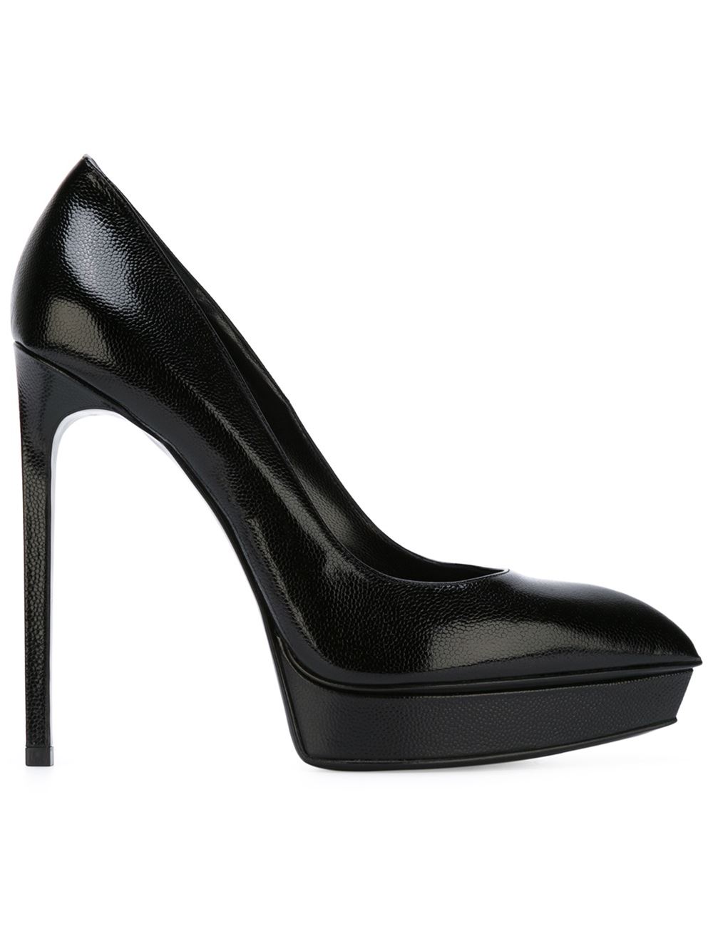 - Saint Laurent 黑色 牛皮 'Janis'高跟鞋。 尖头, 厚鞋底, 鞋垫饰有品牌浮雕, 细高跟。