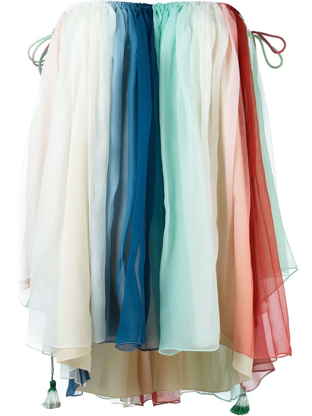 - Chloé 多色 丝绸 条纹罩衫。 露肩设计, 长袖, 直条纹, 渐色效果, 垂褶细节, 直筒腰。这件商品尺码偏大,请选择小一号。