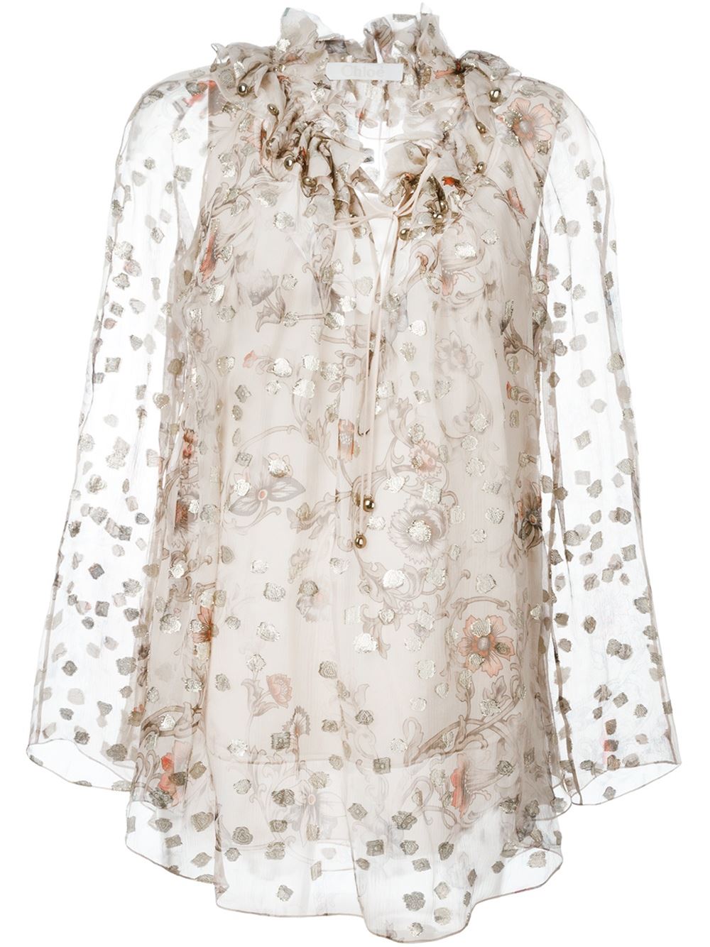 - Chloé 米色与金色 丝绸混纺 花卉罩衫。 V领, 荷叶边饰, 长袖, 后置褶饰细节。