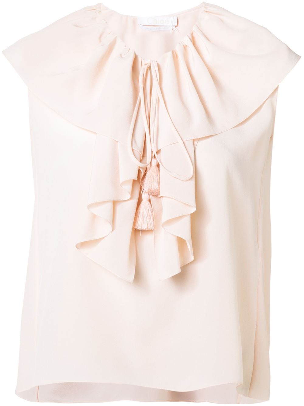 - Chloé 浅粉色 丝绸 荷叶边上衣。 领口饰有荷叶边, 流苏细节, 无袖设计, 平直下摆。