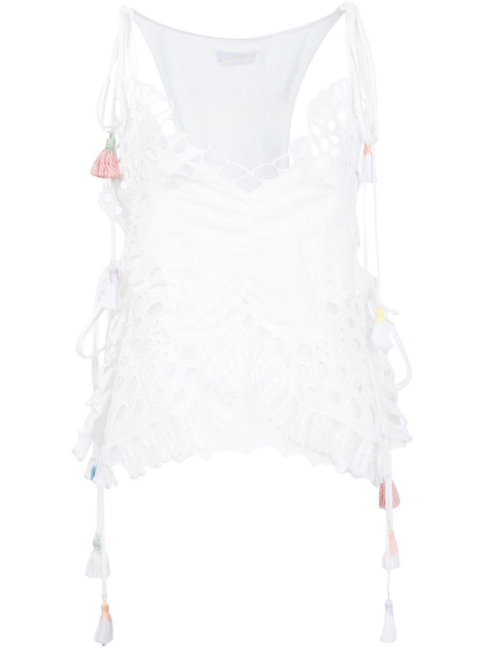 - Chloé 牛奶白色 亚麻混纺 蝴蝶刺绣上衣。 V领, 流苏细节, 挖剪细节, 无袖设计, 长度不对称, 短款。
