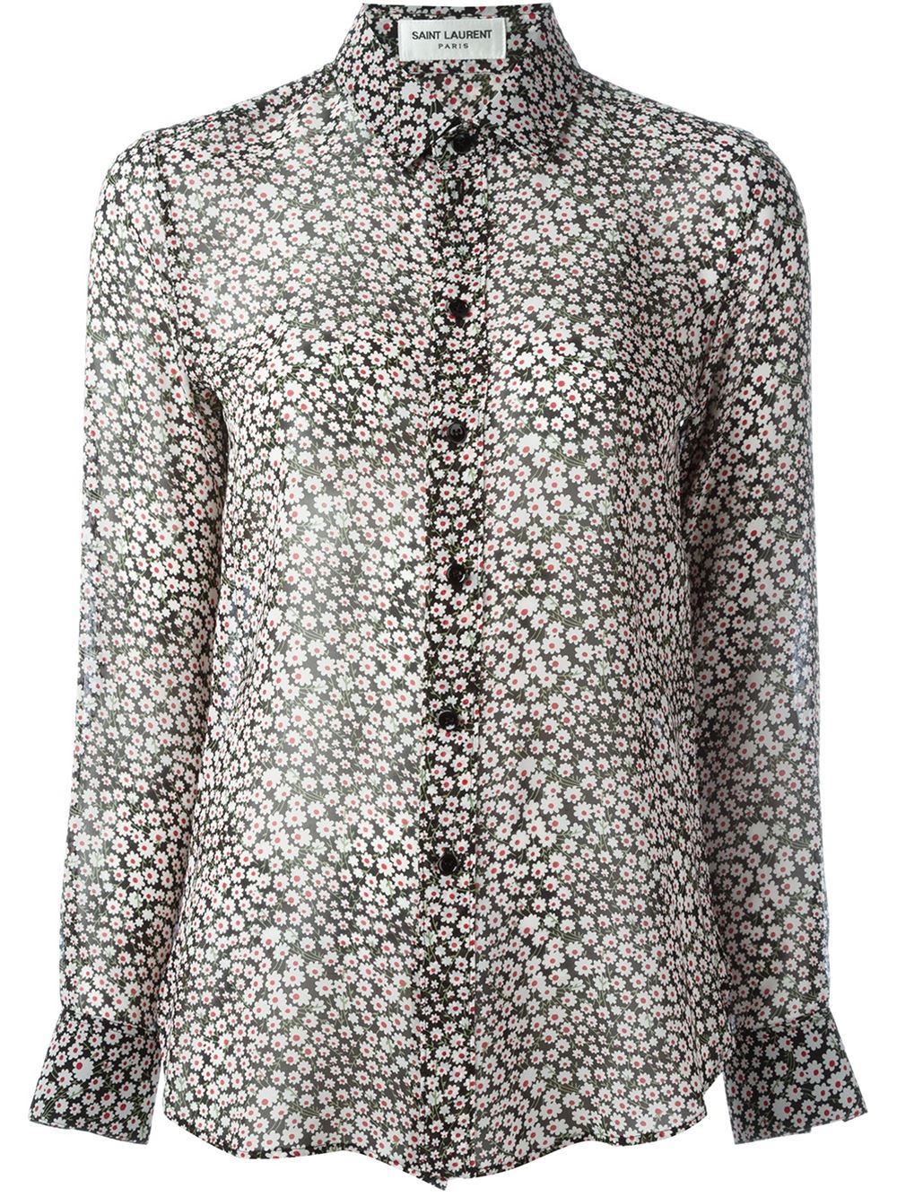 - Saint Laurent 黑色白色红色 花卉印花衬衫。 经典衣领, 正面竖排纽扣, 长袖, 搭扣袖口, 碎花印花, 半透明设计, 曲线形底边。
