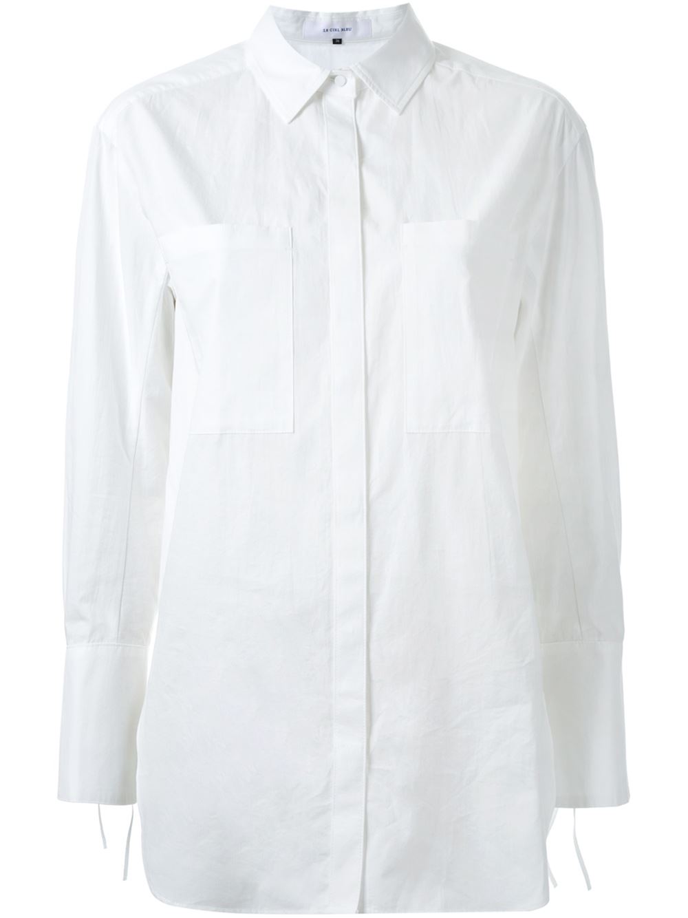 - Le Ciel Bleu 白色 全棉 'Dungaree Ribbon'衬衫。 隐藏式正面开合, 后置绑带, 胸袋。