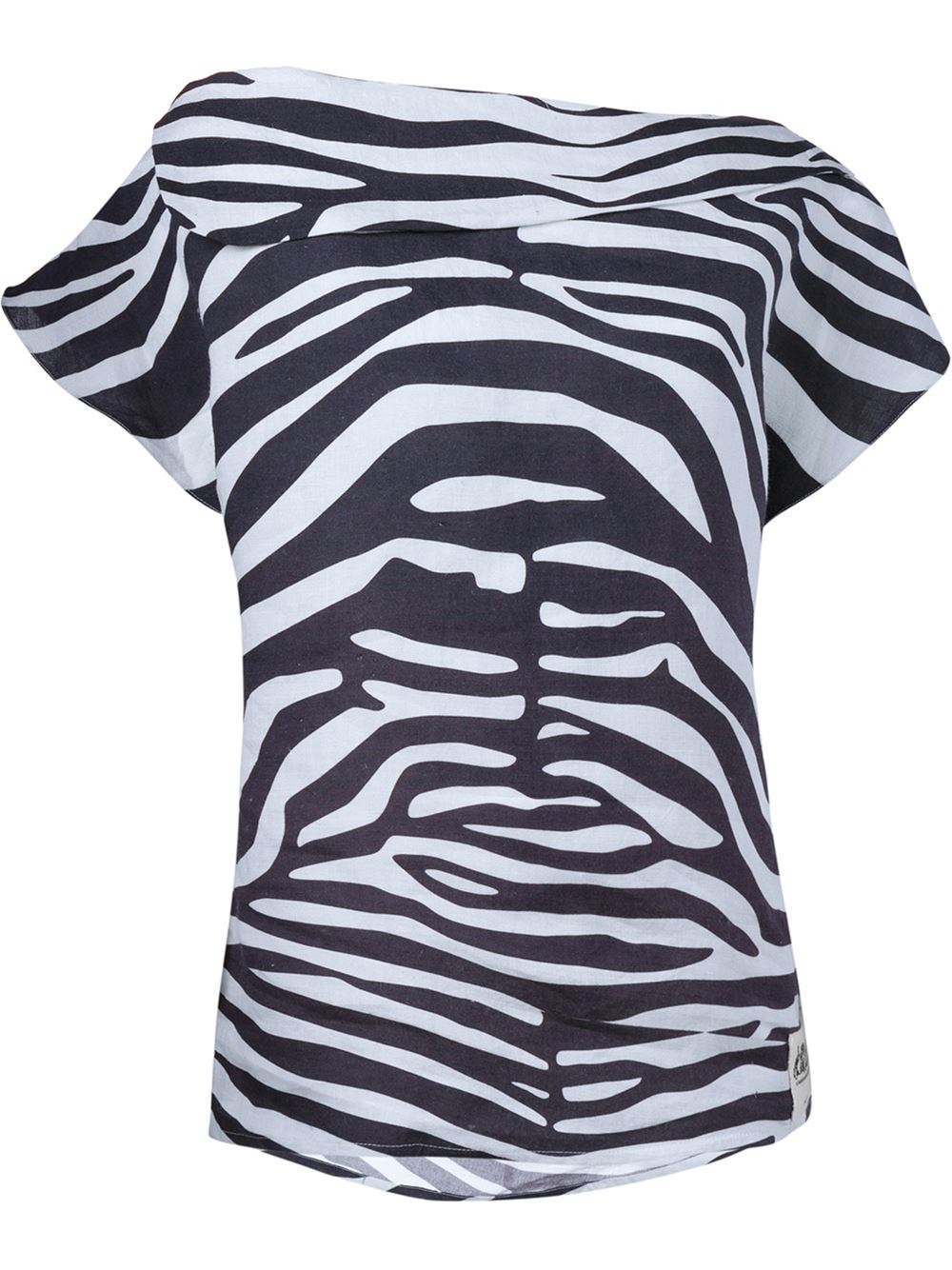 - This black and white A.W.A.K.E. off-shoulder zebra print top is an eye-catching design from the London-based fashion brand's SS '16 collection which drew inspiration from the zebra. Constructed in the UK from ramie, this one-shoulder top features an elongated hem, cream logo-embroidered canvas patch detail and all-over zebra print pattern. Pair yours with bright hues and black suede sandals for a daring feminine ensemble.