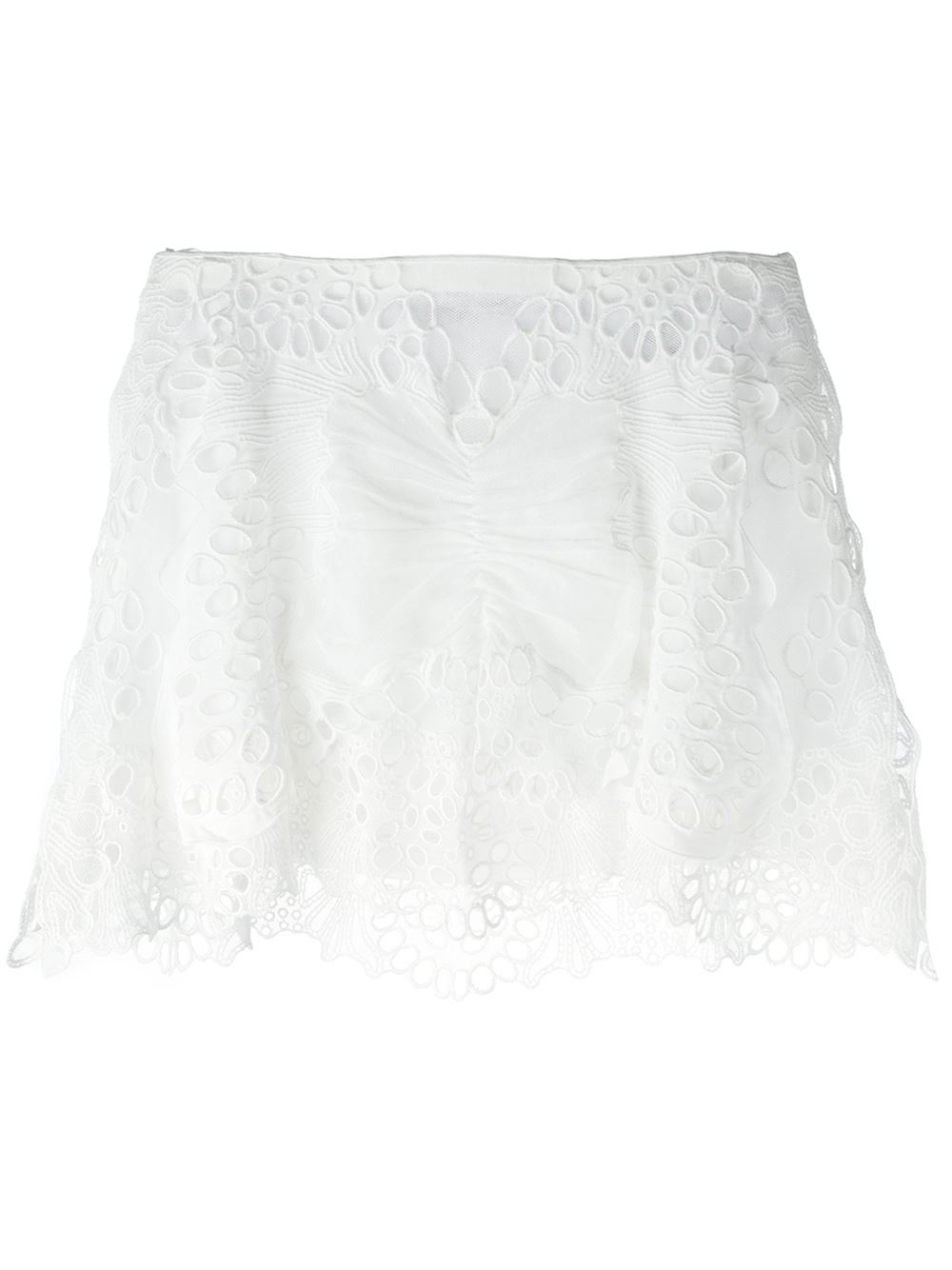 - Chloé 白色 丝绸棉质亚麻混纺 A字形刺绣半身裙。 高腰, 腰边, 隐藏式开合, 扇贝形细节, 短款。