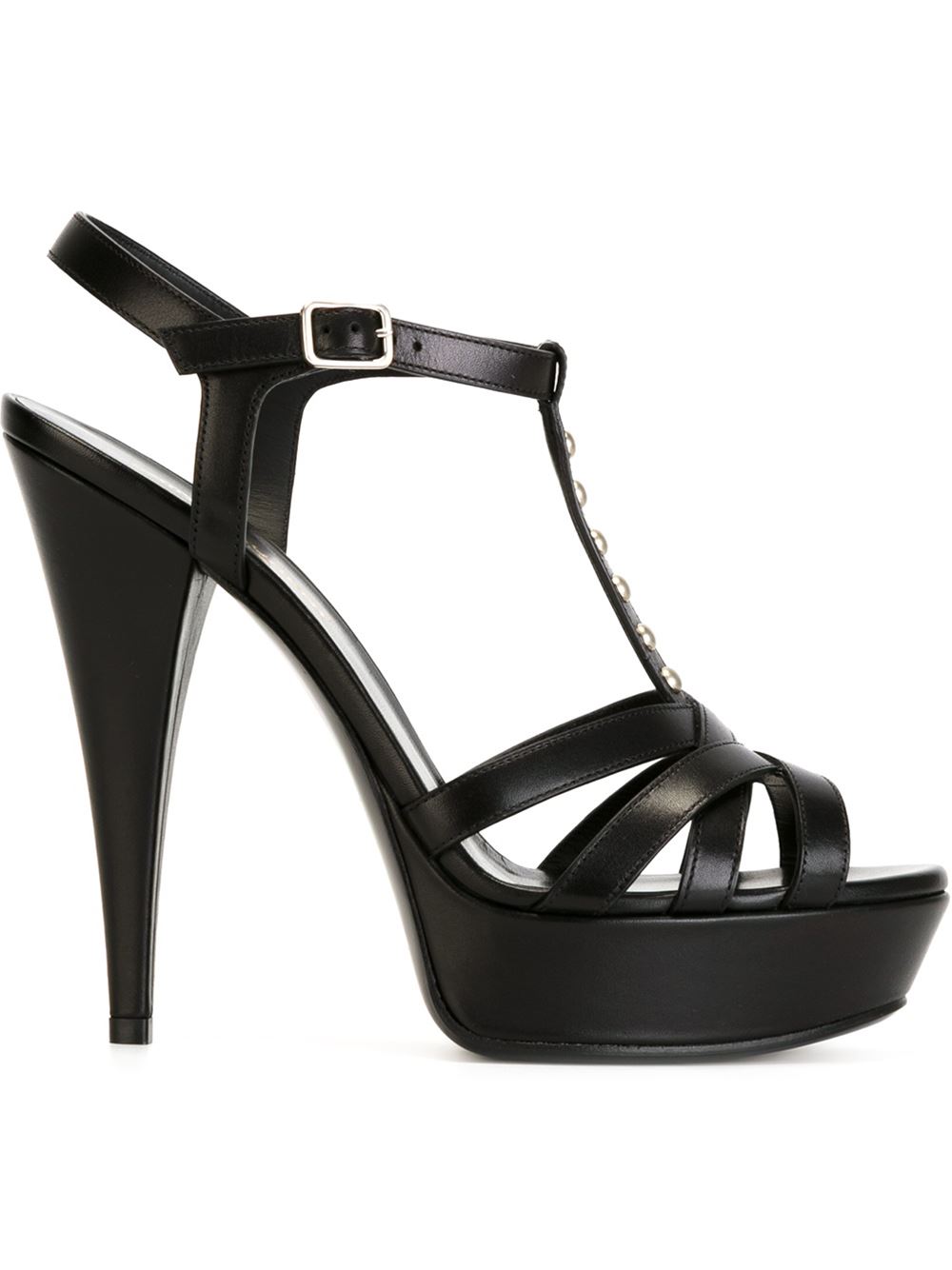 - Saint Laurent 黑色 牛皮 'Classic Tribute 105'凉鞋。 露趾, T字鞋带, 搭扣踝带, 细高跟, 厚鞋底。